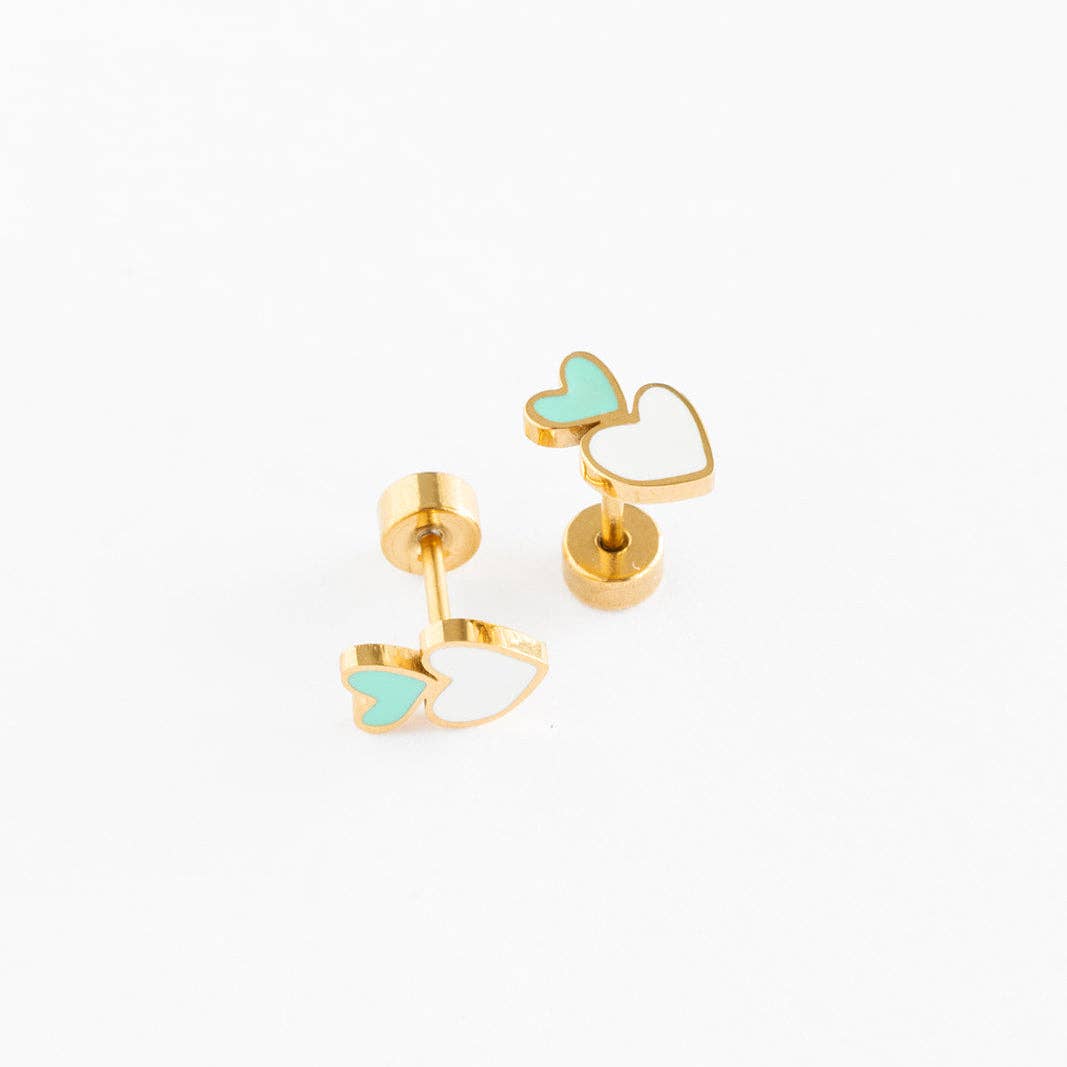 Mint Green & White Heart Stack Enamel Earring Studs – Flat Screw Back Design for 24/7 Wear by Lana Effron