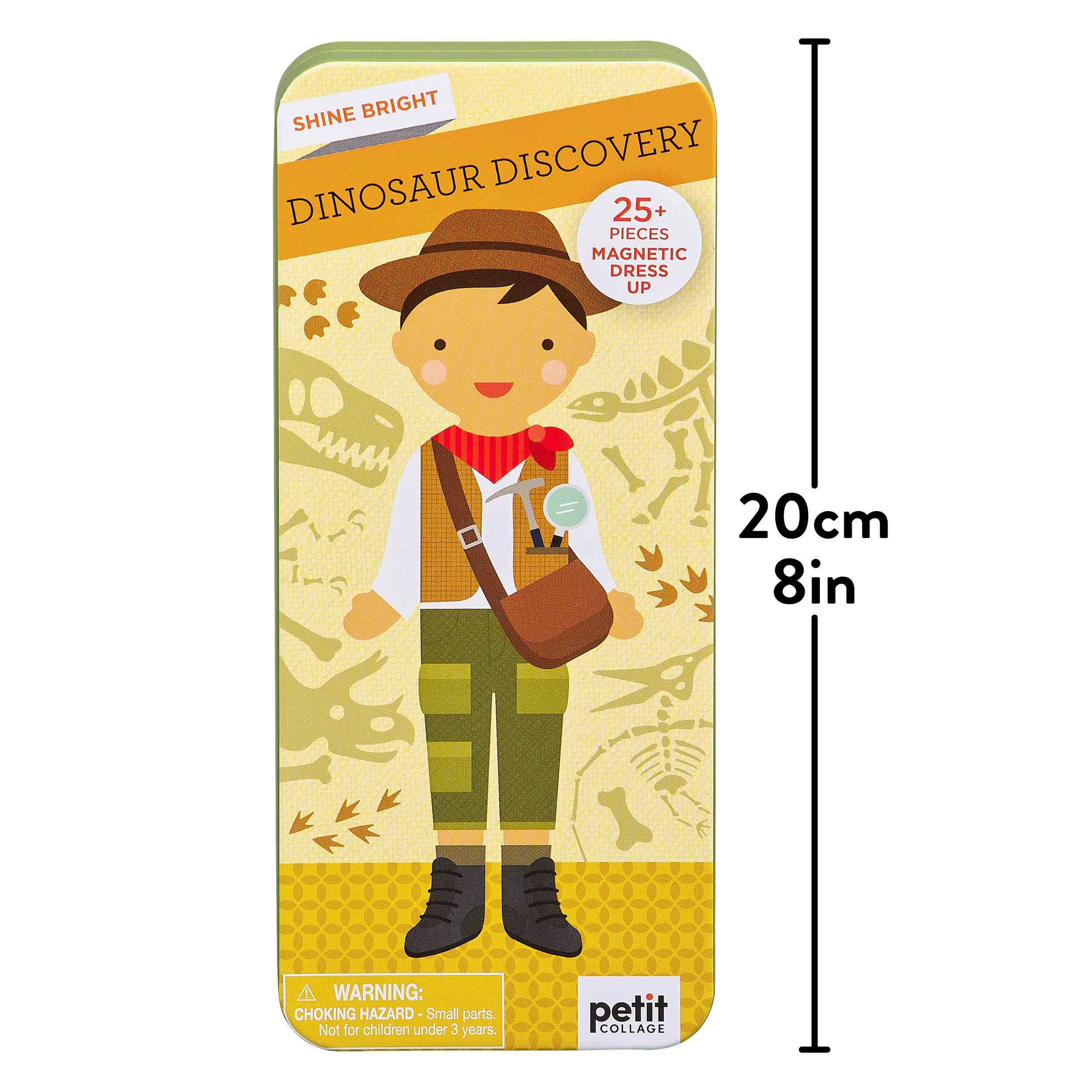 Discoverer. Explorer. Always curious. Using the included magnetic pieces, accessorize your paleontologist and dinosaur themed scene - dream big and shine bright!
