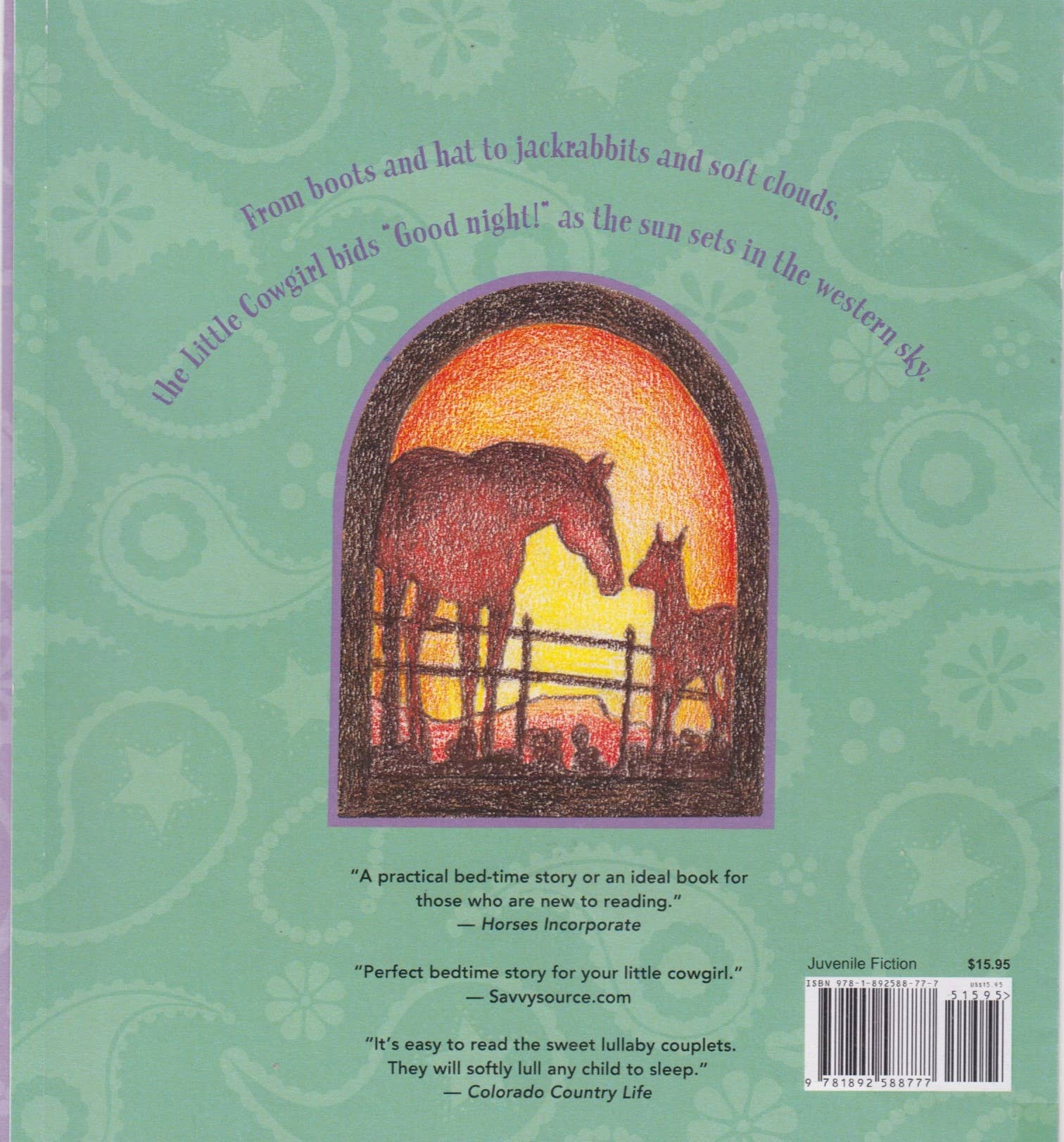 As sleep comes, the little cowgirl's happy heart bids good night to all in her world that has made her day safe and glad. Couplets in lullaby rhythm gently invite little ones to enter sleep, while original artwork guides their minds' eyes from the sweet-smelling cow pony nodding in the shed to the prairie grasses whispering. (No specific state mentioned.)