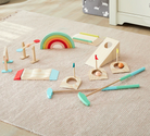 It’s GOOD! It’s WOOD! It’s GOLF! Your kids will have hours of fun with our Good Wood Mini Golf Game. So many different configurations make this game different every time. Set up easy to difficult courses to make the game more challenging. Complete with 3 holes and flags, 2 wooden balls, 5-piece rainbow tunnel, 1 bead curtain obstacle, 1 spinner obstacle, one flat bridge and one wavy bridge. Plus 2 adjustable height wooden putters for your littlest tiger. We give it FORE stars!