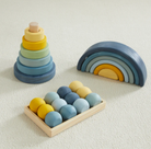 - Six warm-tone stained wood semicircles for toddlers to delight in stacking, nesting and endless shape-building!